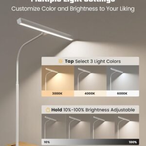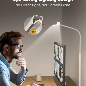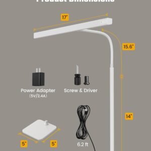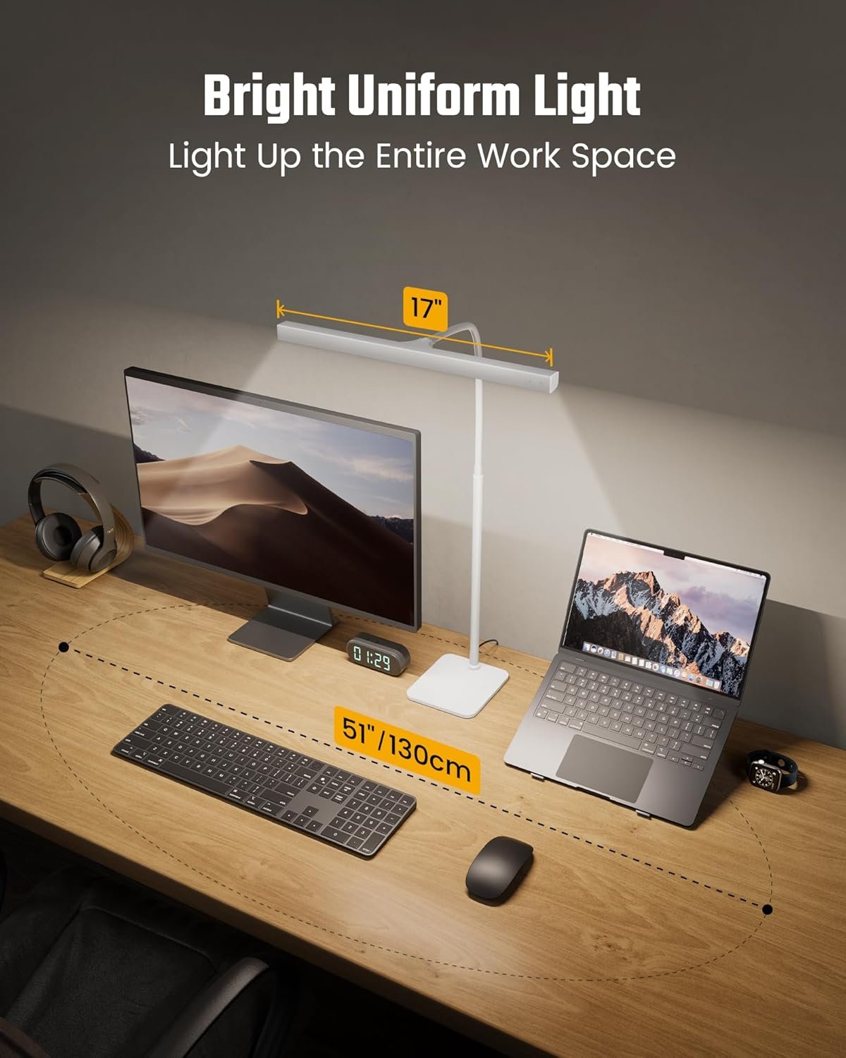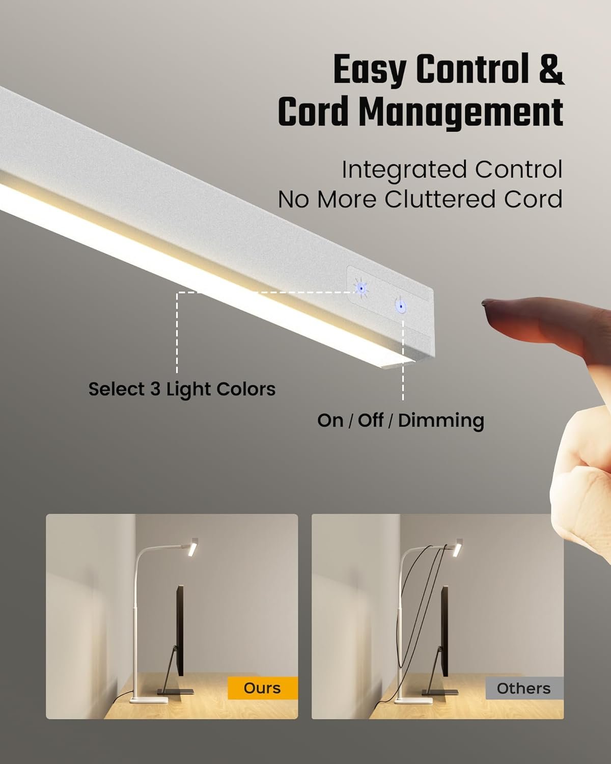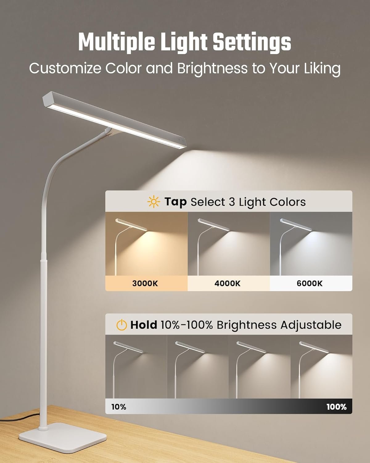 PROTEGE TUS OJOS, AHORRA ENERGÍA: Diseñada con un haz inclinado de 45°, esta lámpara de escritorio reduce el resplandor de la pantalla en un 30% en comparación con las luces de pantalla estándar, lo que facilita las largas horas frente al monitor para tus ojos. La iluminación asimétrica evita el contacto directo con la visión, ayudando a reducir la fatiga ocular. Con 60 LED de alta eficiencia, ofrece una cobertura amplia y uniforme de luz mientras utiliza un 80% menos de energía que las bombillas tradicionales. Aspecto limpio, controles simples: olvídate de los cables desordenados: esta luz de escritorio cuenta con controles táctiles integrados directamente en la barra de luz para un funcionamiento rápido y fácil. También incluye una función de memoria que recuerda tus ajustes de brillo y color anteriores, para que puedas volver al trabajo sin tocar los botones cada vez. COLORES Y LUMINOSIDAD PERSONALIZADOS: Elige entre 3 temperaturas de color: blanco cálido (3000 K), blanco neutro (4000 K) o blanco frío (6000 K). Cada modo admite una atenuación suave del 10% al 100%, por lo que puedes ajustar finamente tu iluminación ya sea que estés leyendo, trabajando, haciendo manualidades o jugando. Diseño ajustable y duradero: el cuello de cisne flexible de 360° le permite colocar la lámpara de cuello de cisne exactamente donde la necesita, hasta 71,1 cm de alto, ideal para pantallas de entre 15 y 73,7 cm. Hecho de silicona resistente y metal, el cuello puede flexionarse hasta 100.000 veces sin desgastarse. Una base de metal estable de 12,7 cm x 12,7 cm lo mantiene firmemente en su lugar. TODO LO QUE NECESITAS ESTÁ INCLUIDO: En la caja obtienes: 1 lámpara de escritorio, 1 base de metal, 1 adaptador de corriente USB (5V/2.4A) y 1 manual del usuario. Aliméntalo con el adaptador o a través de un puerto USB en tu computadora o banco de energía. La lámpara de escritorio de arquitecto ofrece un brillo que cuida los ojos, un excelente control del calor y una vida útil duradera.