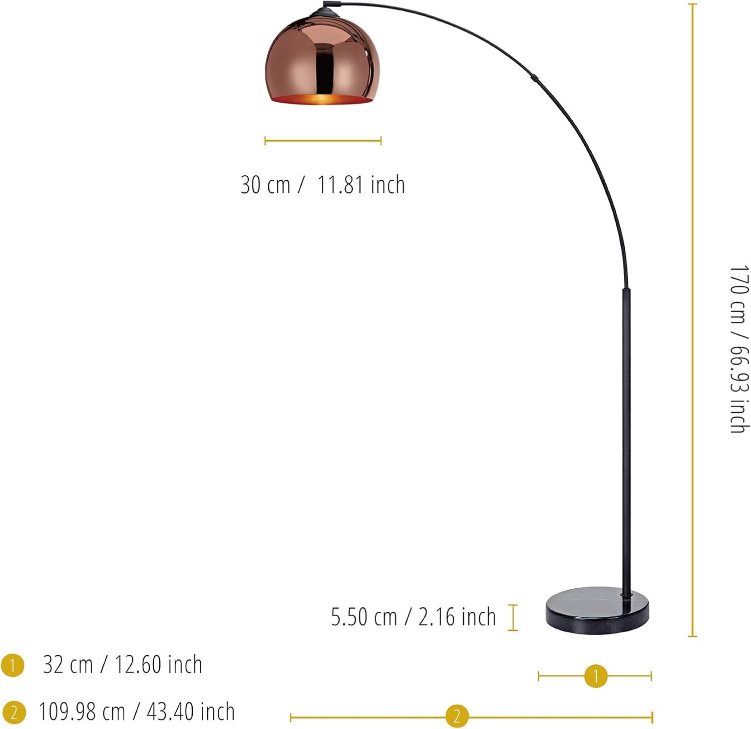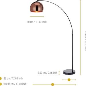 Punto decorativo focal: Lámpara de pie de arco moderno de mediados de siglo con base de mármol negro sintético y pantalla de campana metálica redondeada de oro rosa. Colocación flexible: práctico interruptor de encendido y apagado, y cable de alimentación de 200,0 cm, no es necesario estar justo al lado de una toma de corriente. Para iluminación ambiental, de tareas o de acento: ideal para salas de estar, comedores, dormitorios u oficinas. Fáciles de instalar: instrucciones fáciles y detalladas paso a paso (idioma español no garantizado), y todas las herramientas necesarias para su instalación. La lámpara se ilumina con una bombilla LED E26 de 40 W / 6 W (no incluida). Dimensiones: 110,2 cm x 30,0 cm x 170,0 cm (largo x ancho x alto). Pantalla: 30,0 cm x 21,0 cm (diámetro x alto).