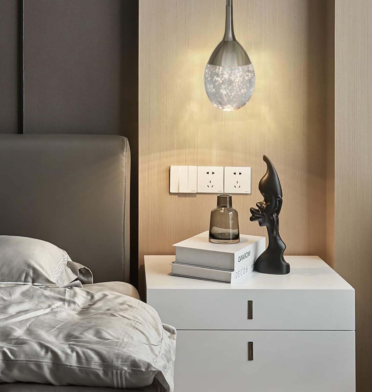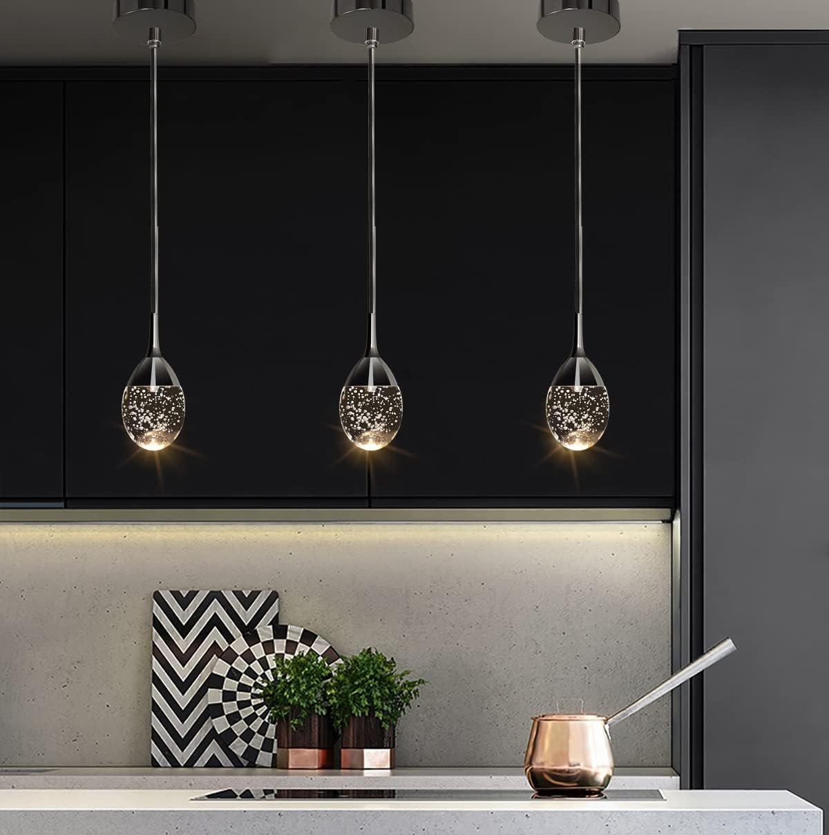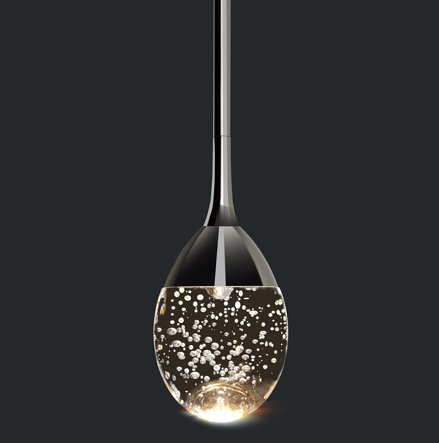 La lágrima es de vidrio real, sólida, pesada y totalmente hermosa en peso de 2.4 libras. Es soplado a mano y burbujas rellenas en el interior. Este accesorio emite una amplia luz cálida y acogedora y es tan hermoso con las burbujas que arrojan motas de luz en todas las direcciones. Ojos llamativos y únicos. Es una forma y diseño ligero muy elegante y moderno. Contemporáneo pero combina bien con antigüedades y decoración de fantasía. Definitivamente una pieza central de cualquier habitación, incluso cuando está apagada. El acabado es cromado negro. El negro combina perfectamente con el vidrio transparente. La cubierta de aluminio está diseñada para que coincida con la forma del vidrio y disipa el calor rápidamente, una buena protección a los chips LED. La fuente de iluminación está integrada LED 6W (equivalente a 40 vatios incandescentes), luces cálidas 3000K. No necesita ninguna bombilla ni reemplazar la bombilla. Regulable si se añade un regulador de intensidad (atenuador no incluido). La altura es ajustable. Esta pequeña gota de lluvia incluye extensiones de 10 x 4 que se pueden atornillar para hacer que 127,0 cm sea la más larga y 25,4 cm más corta. Se incluye un adaptador para que la lámpara pueda instalarse en un techo inclinado o abovedado. El montaje y la instalación son muy fáciles y sencillos, con instrucciones claras y concisas. Adecuado para cocina, comedor, sala de estar, dormitorio, fregadero, pasillo, bar.