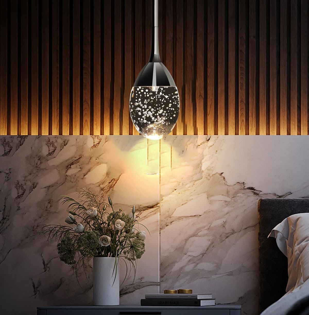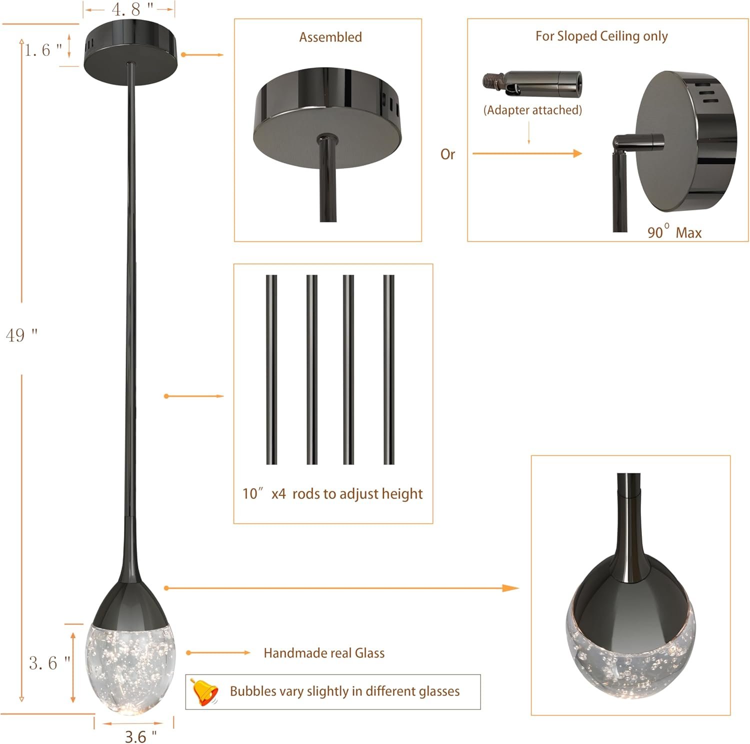 Características especiales: Cromo negro galvanizado, Diseño único y fácil instalación, LED 6W equivale a la iluminación de E26 60W, Vidrio real sólido pesado de alta calidad, burbujas uniformes y llenas para hacer una luz increíble