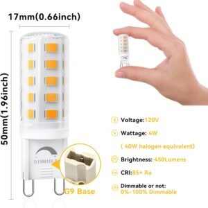 Características especiales: Bombillas LED G9 regulables, 3000 K blanco cálido suave, base G9 bi pin de 4 W (equivalente a halógeno de 40 W), 450 lúmenes, ángulo de haz de 360°, CRI>85, eficiencia energética, perfecto para lámpara de araña, excelente disipación de calor
