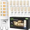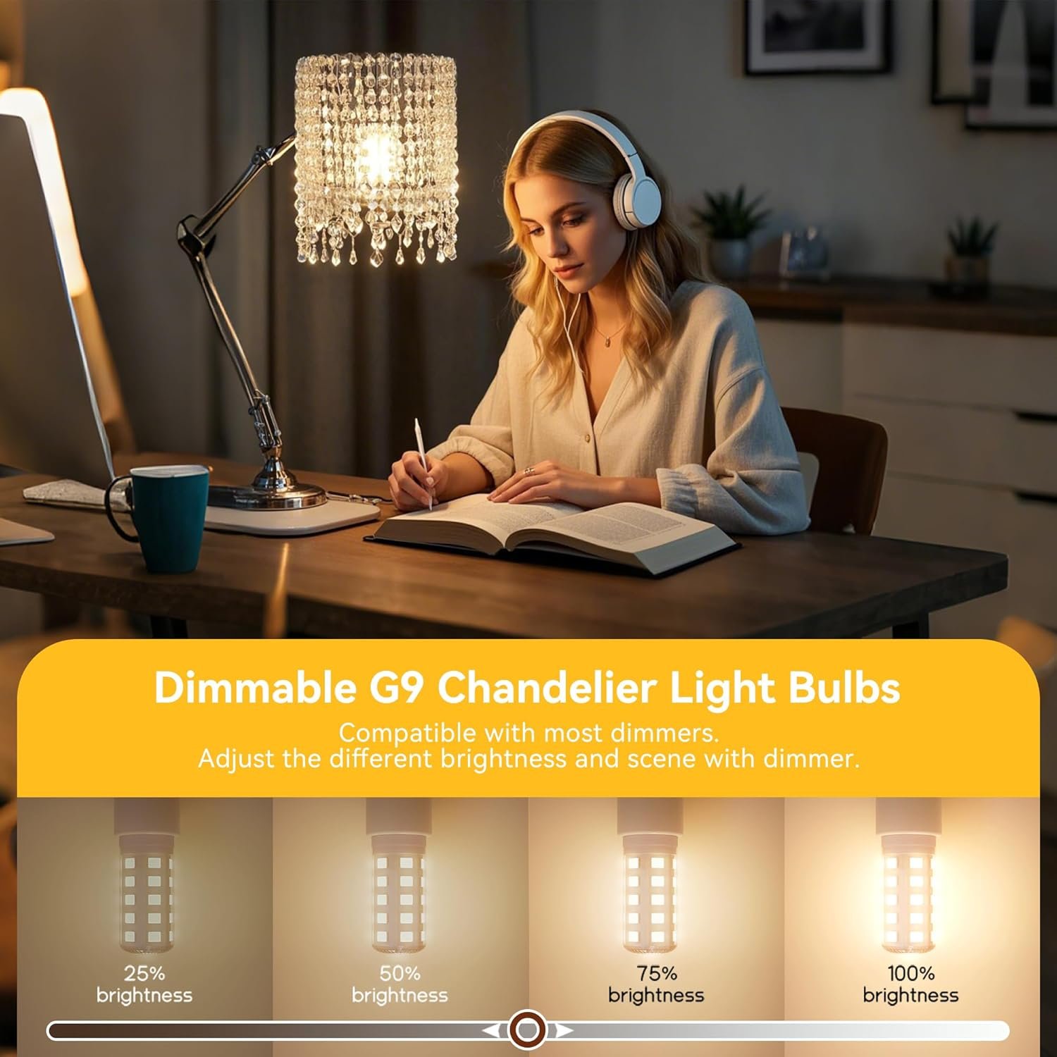 Bombilla LED G9 regulable de 40 W: La bombilla de zócalo G9 de TJOY es compatible con varios reguladores para tener un control de atenuación suave. Puede ajustar el brillo del 0% al 100%. Diferentes niveles de brillo para satisfacer varias necesidades para que puedas usar la bombilla g9 de manera más conveniente y cómoda. También se pueden utilizar como bombillas no regulables Reemplazo perfecto para bombilla halógena G9: La bombilla G9 puede sustituir a la lámpara halógena de 40 W y ahorrar un 90% de energía. Se puede utilizar hasta 15.000 horas. Las bombillas regulables g9 de Tjoy tienen un menor consumo de energía y una vida útil más larga. No solo te ahorra dinero en tu factura de electricidad, sino que también reduce la molestia de cambiar las bombillas con tanta frecuencia Base G9 estándar de doble clavija para rápida disipación del calor: la bombilla LED de base G9 utiliza una base de cerámica de dos pines resistente al fuego, que tiene un rendimiento de disipación de calor superior a las bombillas LED ordinarias. Tamaño del producto ( xH): 1,7 cm x 5,0 cm. Adecuado para la mayoría de accesorios de base G9: como candelabros de cristal, colgantes, lámparas de techo, armarios, lámparas de pared y lámparas de mesa. Crea un ambiente de iluminación único para ti Blanco cálido de 3000K e iluminación completa de 360°: nuestras bombillas de araña tienen un alto índice de reproducción cromática de 85+ y emiten uniformemente 3000K de luz blanca cálida desde un ángulo de 360 grados. 32 luces LED iluminan tu casa desde todos los ángulos sin sombras ni esquinas ciegas Sin parpadeo y amigable con los ojos: cuando giras el interruptor, estas bombillas G9 de ahorro de energía se encienden inmediatamente con 450 lúmenes de brillo sin parpadeo ni zumbido. No hay rayos UV ni infrarrojos en el espectro, ni calor ni radiación, no es agresivo para los ojos. Amistoso para la vista de la familia y los niños Servicio posventa: TJOY proporciona 1 año de servicio posventa estándar para las bombillas LED G9. El reemplazo o reembolso se emitirá inmediatamente por cualquier problema del producto dentro de 1 año. No te preocupes por el servicio posventa.