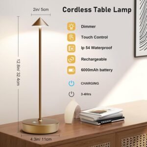Carga rápida : Esta lámpara de mesa está equipada con una batería recargable de alta capacidad de 6000 mAh, lo que permite un funcionamiento inalámbrico. Solo tarda 4-5 horas en cargar completamente la batería. Una vez cargada, la lámpara puede proporcionar iluminación continua durante 15-40 horas, dependiendo del nivel de brillo seleccionado. Atenuación táctil : lámpara de mesa equipada con interruptor táctil, simplemente toca la función de interruptor de la luz de control con tus dedos. Al mantener presionado el interruptor se permite un ajuste de atenuación suave entre un 10% y un 100% de brillo, y también admite el cambio entre 3 modos de iluminación: blanco cálido, blanco natural y blanco frío (3000K/4500K/6000K). Con su diseño de iluminación de 360 grados, la lámpara es perfecta para varios entornos como reuniones familiares, luz nocturna junto a la cama e iluminación diaria para el trabajo. Decoración minimalista: altura: 33,0 cm, diámetro: 10,2 cm, peso: 1.2 libras. Diseñado con una estética elegante y moderna, con una forma triangular y fabricado con material de aleación de aluminio duradero con propiedades resistentes a los arañazos. La parte inferior está equipada con almohadillas de silicona antideslizantes, lo que garantiza una colocación segura. Su diseño inalámbrico permite una cómoda portabilidad, por lo que es muy adecuado para varios espacios contemporáneos como hogares, salas de estar, dormitorios, comedor, patios, etc. Diseño resistente al agua para exteriores : La lámpara de escritorio cuenta con un diseño resistente al agua IP54, que previene eficazmente daños en los circuitos y garantiza que no se vea afectada por el agua o los líquidos. Se puede utilizar fácilmente incluso en ambientes húmedos. Como resultado, es muy adecuado para aventuras al aire libre, camping y diversas actividades Excelente valor y garantía del producto : Tu compra incluye 1 lámpara de escritorio, 1 cable de carga USB y 1 guía de usuario. Si tu lámpara encuentra algún problema dentro del primer año, no dudes en ponerte en contacto con nosotros sin dudarlo. Nuestro equipo responderá tan pronto como sea posible para proporcionar asistencia para la solución de problemas u organizar un producto de reemplazo.