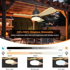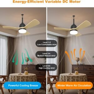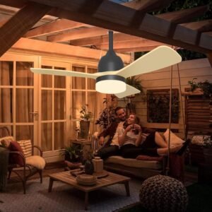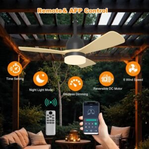 Plug and Play: viene con un cable de alimentación sin enredos de 20 pies para una fácil configuración sin cableado complicado. Nota: Diseñado para uso en interiores/semi-exteriores (IP4 a prueba de salpicaduras), evite la exposición directa a fuertes lluvias. Fácil instalación: Compatible con varios tipos de techo. Incluye ganchos de montaje y tornillos inoxidables. Se instala en menos de 10 minutos en techos de hormigón, madera o metal sin herramientas profesionales. Control remoto y aplicación: cuenta con 6 velocidades de ventilador con control de temporizador independiente tanto para ventilador como para luces a través del control remoto o la aplicación. Brillo ajustable (10%-100%) y temperatura de color (blanco cálido/neutro/frío) para diferentes escenarios.