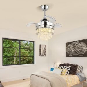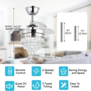 Ventilador de techo de cristal de 55,9 cm: candelabro de cristal K9 retráctil y ventilador de techo moderno 2 en 1; diseño de cristal lujoso y brillante, por lo que es la elección perfecta para los amantes de los candelabros. Ventiladores de Araña LED con 6 Velocidades de Viento y Temporizador: Ventiladores de techo con luces de 6 velocidades y tres colores, la velocidad del ventilador y la iluminación de araña se pueden ajustar individualmente mediante control remoto. Ventilador de techo reversible: adecuado para todas las estaciones. Modo de avance y retroceso. El ventilador de techo con luces de cristal te permite cambiar la dirección del modo de corriente descendente durante el verano al modo de corriente ascendente durante el invierno. Hoja invisible: 4 aspas de ventilador de techo acrílicas retráctiles, 55,9 cm cuando se extiende. Cuando se abre y se cierra, la hoja se extenderá y se retrae automáticamente. Varilla de 5 u 20,3 cm para elegir. Adecuado para estudiar o trabajar en la luz. Se pueden aplicar tres opciones de temperatura de color a una variedad de escenas. Instalación Fácil: La instalación de este ventilador de techo es muy fácil, cualquier pregunta durante la instalación puede contactarnos en cualquier momento.