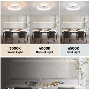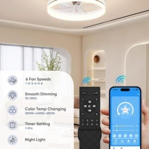 Luz LED regulable de 38 W Esta moderna lámpara de ventilador de techo tiene una función de atenuación inteligente, puedes ajustar fácilmente el brillo (10-100%) y la temperatura de color (3000 K-6500 K) mediante control remoto/aplicación. Al ajustar con el control remoto, activará automáticamente la función de memoria para mantener el brillo y la temperatura de color de este momento cuando lo enciendas la próxima vez. Control remoto y aplicación Este pequeño ventilador de techo con luz se puede controlar mediante la aplicación inteligente (Bluetooth) y control remoto, el ventilador y la luz se pueden controlar por separado. Ajuste fácilmente la velocidad del ventilador, el brillo de la luz y la temperatura del color, la función de temporizador y la función de inversión del ventilador. Consejo: Cuando lo use por primera vez, siga los pasos del manual para emparejarlo. 6 velocidades y aire reversible Este ventilador de techo de perfil bajo viene con un motor CC de bajo ruido y 6 configuraciones de velocidad. Con flujo de aire reversible, puede liberar aire frío cuando hace calor y hacer circular aire fresco invirtiendo la dirección del flujo de aire cuando hace frío, adecuado para uso durante todo el año. Con alta potencia eólica y bajo nivel de ruido, es perfecto para usar en el dormitorio para proporcionarte un ambiente cómodo y silencioso para dormir. Fácil instalación La instalación es rápida y fácil, la luz del ventilador ya está premontada, todo lo que necesitas hacer es conectar los cables y montar el ventilador de techo con luz en el techo, se incluyen los accesorios de montaje e instrucciones detalladas. Alta calidad y duradero Nos comprometemos a proporcionar productos de calidad, esta luz de ventilador viene con 2 años de soporte técnico, si tienes alguna pregunta, ¡por favor háznoslo saber!