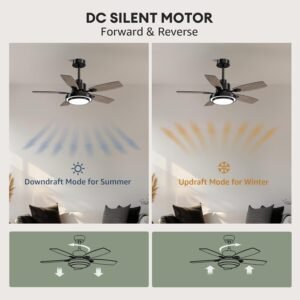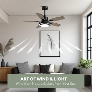 Características especiales: APP y control remoto, Funcionamiento silencioso, motor de CC reversible, Función de iluminación y memoria del ventilador, Temperatura de color ajustable, brillo regulable, Temporizador de 1/2/4/8 horas, altura ajustable con varilla descendente de 4.9 pulgadas y 8 pulgadas