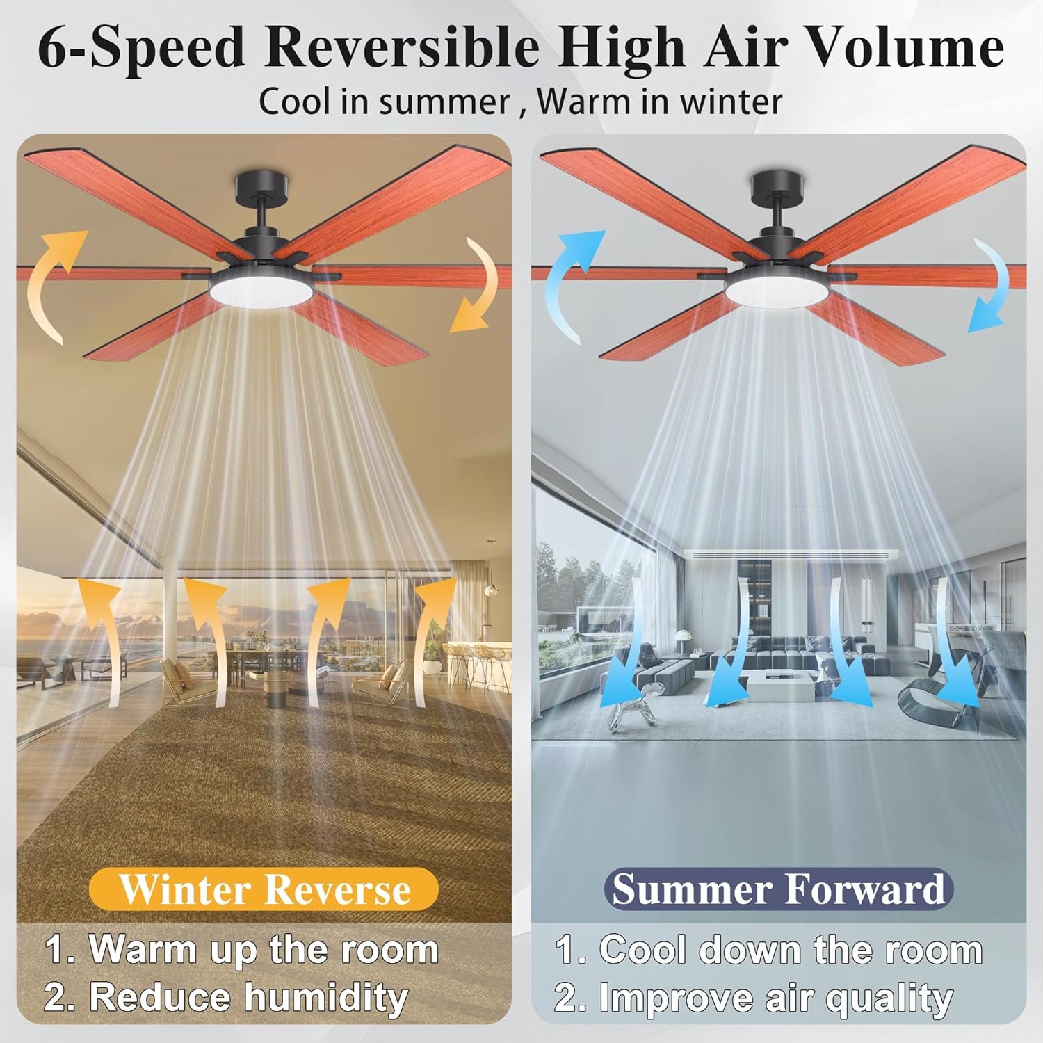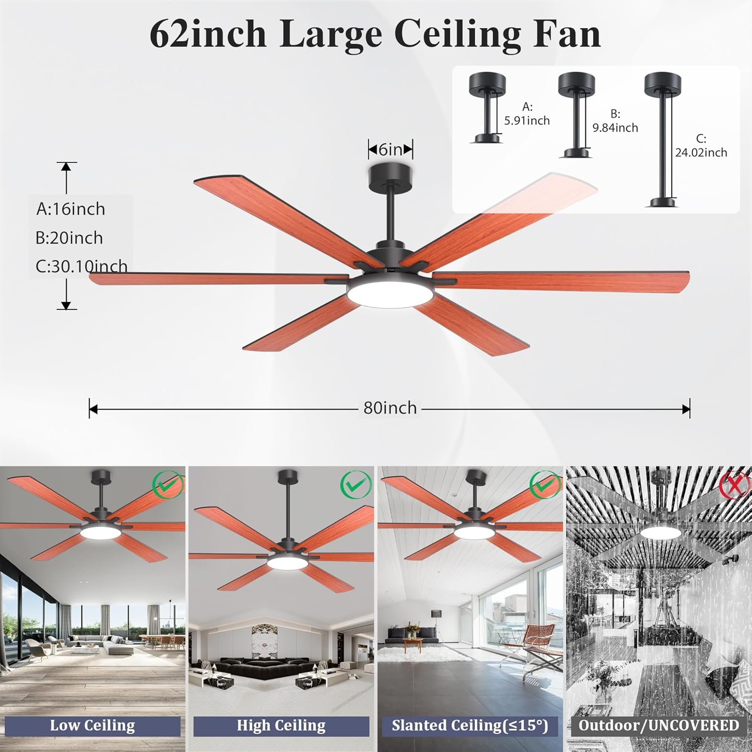 Ventiladores de techo con luces: el moderno ventilador de techo DIAMONDFORGE no es solo una pieza funcional; es una pieza central elegante que eleva la estética de tu hogar mientras ofrece un potente flujo de aire e iluminación brillante y equilibrada. Nuestro ventilador de techo de 203,2 cm con luz controlada a distancia cuenta con una calificación de eficiencia energética A, reduciendo el uso de electricidad en un 80% en comparación con los ventiladores tradicionales, ahorrándote dinero sin comprometer el rendimiento. Motor CC silencioso y eficiente: Disfruta de una calma ininterrumpida con el motor CC casi silencioso de nuestro ventilador de techo industrial grande, diseñado para operar a solo 30 dB, un suave zumbido más suave que el aleteo de una mariposa. Perfecto para hogares con personas que duermen poco, personas mayores o niños pequeños, asegura ambientes tranquilos sin comprometer el rendimiento. Impulsado por un motor CC de alta eficiencia, este ventilador ofrece un 65% menos de consumo de energía que los motores AC tradicionales. Los ventiladores de techo para exteriores son ideales para patios Ventiladores de techo con luces: ventilador reversible ajustable de 6 velocidades que ofrece la brisa perfecta para cada momento, desde un flujo de aire suave y relajante hasta ritmos de viento naturales o enfriamiento potente. Diseñado para versatilidad estacional, simplemente cambia la dirección del ventilador: en sentido antihorario en verano para circular aire fresco o en el sentido de las agujas del reloj en invierno para redistribuir suavemente el aire caliente y crear un ambiente acogedor y equilibrado. Ventiladores de techo inteligentes con luces y control remoto: Simplifique la comodidad diaria con el control remoto todo en uno, poniendo todas las funciones al alcance de su mano. Ajusta sin problemas el ventilador y la luz LED de 24 W para que coincida con tu estado de ánimo o necesidades: enciende y apaga la luz/ventilador, elige entre 3 temperaturas de color personalizables (brillo cálido de 3000 K, luz natural de 4000 K, blanco frío de 6500 K), selecciona entre múltiples velocidades y ajusta un temporizador de apagado automático de 1/2 hora para dormir sin preocupaciones o ahorro de energía. Ventilador de techo para exteriores de 203,2 cm con luz: Este ventilador de techo para exteriores de gran tamaño viene con varillas descendentes de 15,2 cm, 25,4 cm y 61,0 cm, haciéndolo adaptable a varias alturas de techo (16 76,2 cm) ideal tanto para techos bajos acogedores como para espacios altos y amplios. Equipado con 6 aspas aerodinámicas, este ventilador circula eficientemente el aire en áreas grandes, eliminando la necesidad de múltiples ventiladores más pequeños mientras ofrece un flujo de aire potente y uniforme, convirtiéndolo en una actualización rentable y elegante para salas de estar, garajes, graneros, patios cubiertos, cenadores, uso industrial y de taller.