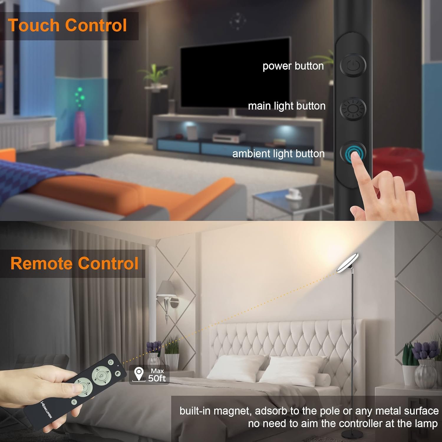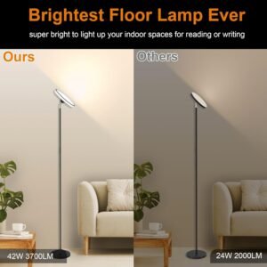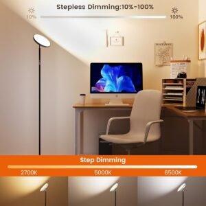 Crea el ambiente perfecto: nuestra lámpara de pie RGB ofrece 12 modos de colores preestablecidos para iluminación ambiental, lo que te permite personalizar tu ambiente para cualquier estado de ánimo u ocasión. Ajusta el brillo del 10% al 100% en modo estático y la velocidad del 10% al 100% en modo dinámico para dar vida a tu espacio de nuevas formas emocionantes. Fácil de instalar, Plug & Play. Perfecto para salas de juegos, relajación, fiestas o reuniones; deja que tus habitaciones brillen con estas impresionantes luces Brillo superior : La luz principal de 42W ofrece más de 3700 lúmenes, desde 2700k de blanco cálido hasta 6500k de blanco frío, sin efectos de deslumbramiento o estroboscópico. Nuestra lámpara de pie moderna ilumina salas de estar, dormitorios u oficinas de manera brillante y uniforme. Suave o regulable por escalones de 10% a 100% de brillo para satisfacer todas tus necesidades de iluminación, ya sea para leer, escribir o trabajar Control remoto y táctil: nuestra lámpara de pie Torchiere cuenta con tecnología avanzada de control RF433 para una conexión más sensible y estable. El palo de luz incluye un imán incorporado para una conveniente fijación al poste o a cualquier superficie metálica. Controla la lámpara fácilmente con tres botones en el poste para control táctil. Distancia máxima remota: 50 pies/15 m Función de memoria y temporizador : Esta lámpara de pie recuerda tus configuraciones anteriores incluso después de ser apagada o durante cortes de energía, ahorrándote tiempo de ajustes frecuentes. Establece el modo de luz nocturna perfecto con opciones de temporización de 1H/2H/3H para tus momentos de sueño. Con una impresionante vida útil de más de 50.000 horas, nuestra lámpara de pie alta es eficiente en energía, ahorrando tu presupuesto y respetuosa con el medio ambiente sin plomo ni mercurio Uso versátil y asistencia : Utilice esta elegante lámpara alta en comedores, habitaciones de niños, cocinas, oficinas, salas de juegos, o para mejorar fiestas de vacaciones y cumpleaños. Es un gran regalo para familiares y amigos. Disfruta de tranquilidad con nuestro servicio de producto de 24 meses. Para cualquier pregunta, por favor contáctenos, estamos aquí para ayudarle