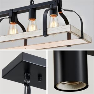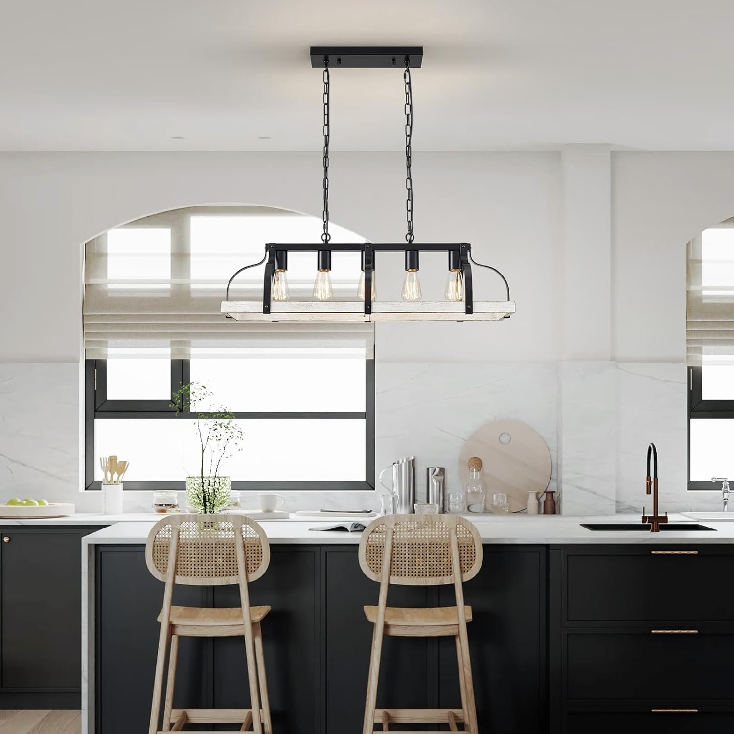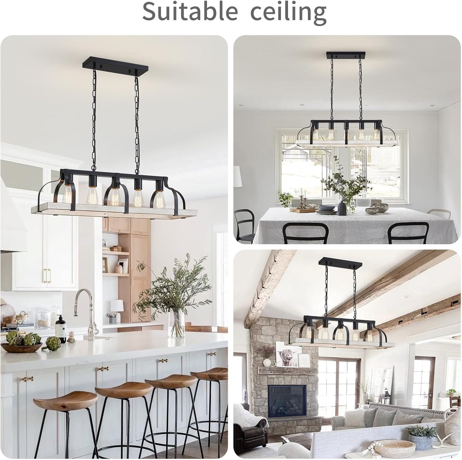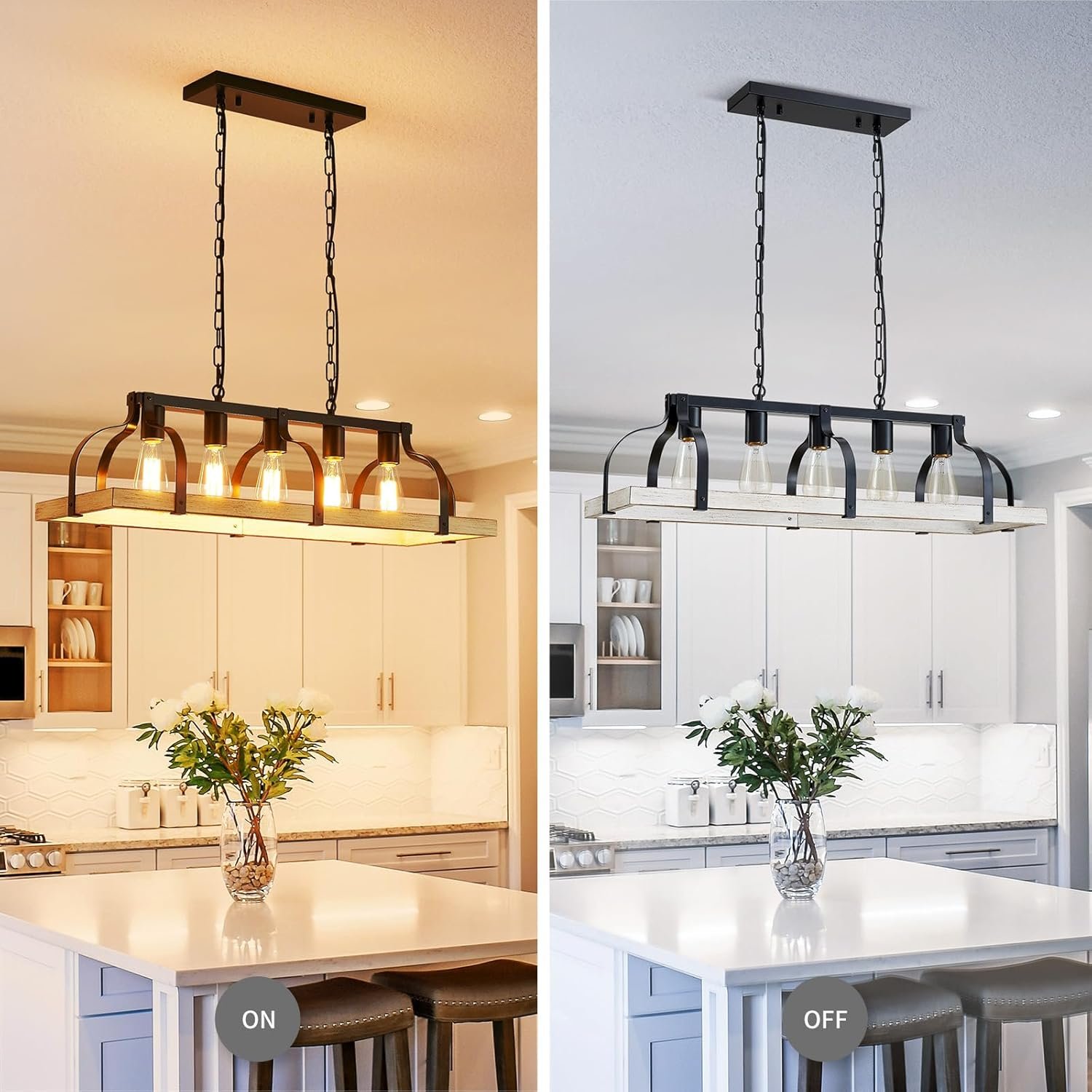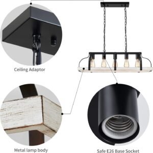 Tamaño de la lámpara de araña: 21,6 cm de alto, 80,0 cm de largo y 25,4 cm de ancho. Cadena: 100,1 cm de alto (máx.). Toldo: 10,9 cm de ancho y 30,0 cm de largo. Base de bombilla: E26, 120 V, 60 vatios (máximo). (*Bombillas no incluidas* Necesitas obtener 5 bombillas LED E26, dependiendo de los efectos de iluminación que desees). Diseño moderno: La lámpara de araña con acabado de imitación de grano de madera blanca antigua le da a tu isla de cocina y comedor un ambiente campestre y añade mucha luz para hogares industriales, de campo o rústicos. Fácil instalación: Requiere montaje, pero fácil de instalar, con todo el hardware de montaje y una instrucción detallada de montaje incluida. Ampliamente utilizado: isla de cocina, comedor, pasillo, sala de estar, porche, hotel, escalera, vestíbulo, dormitorio, oficina, etc.