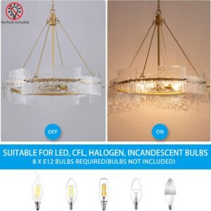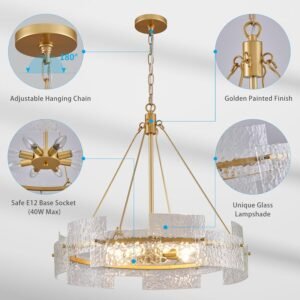 Elegante candelabro de cristal: eleva tu entorno de vida con nuestra exclusiva lámpara de araña de vidrio de inspiración vintage, con un distintivo diseño colgante rústico que actúa como una pieza central cautivadora en cualquier área, complementando sin esfuerzo la decoración de tu comedor o isla de cocina Diseño de altura ajustable: este gran candelabro dorado ofrece una longitud de cadena personalizable que varía de 5,1 cm a 100,1 cm, por lo que es adecuado para varios estilos de techo, incluyendo plano, abovedado o inclinado. Mejora el ambiente en comedores, salas de estar, dormitorios y cocinas Solución de iluminación regulable: con dimensiones de 66,0 cm x 66,0 cm x 57,9 cm, esta moderna lámpara de araña de granja admite 8 portalámparas E12 compatibles con bombillas LED, CFL, halógenas e incandescentes (máximo 40 W por portalámparas). La función regulable te permite establecer el ambiente ideal para cualquier evento Fácil proceso de instalación: experimente una configuración sin esfuerzo para este candelabro colgante de 8 luces con nuestras instrucciones detalladas y tutoriales en video. Asegure la seguridad apagando la fuente de alimentación antes de la instalación. Aviso: para prevenir la rotura del vidrio, cada superficie de contacto utiliza una junta de plástico, no apriete demasiado el tornillo MARCA DE CONFIANZA CON SOPORTE: XINGQI, conocido por su fiabilidad en accesorios de iluminación, enfatiza una calidad excepcional y una atención meticulosa en cada candelabro. Su estilo chic y elegante se adapta a todas tus aspiraciones de decoración de interiores