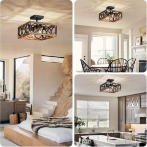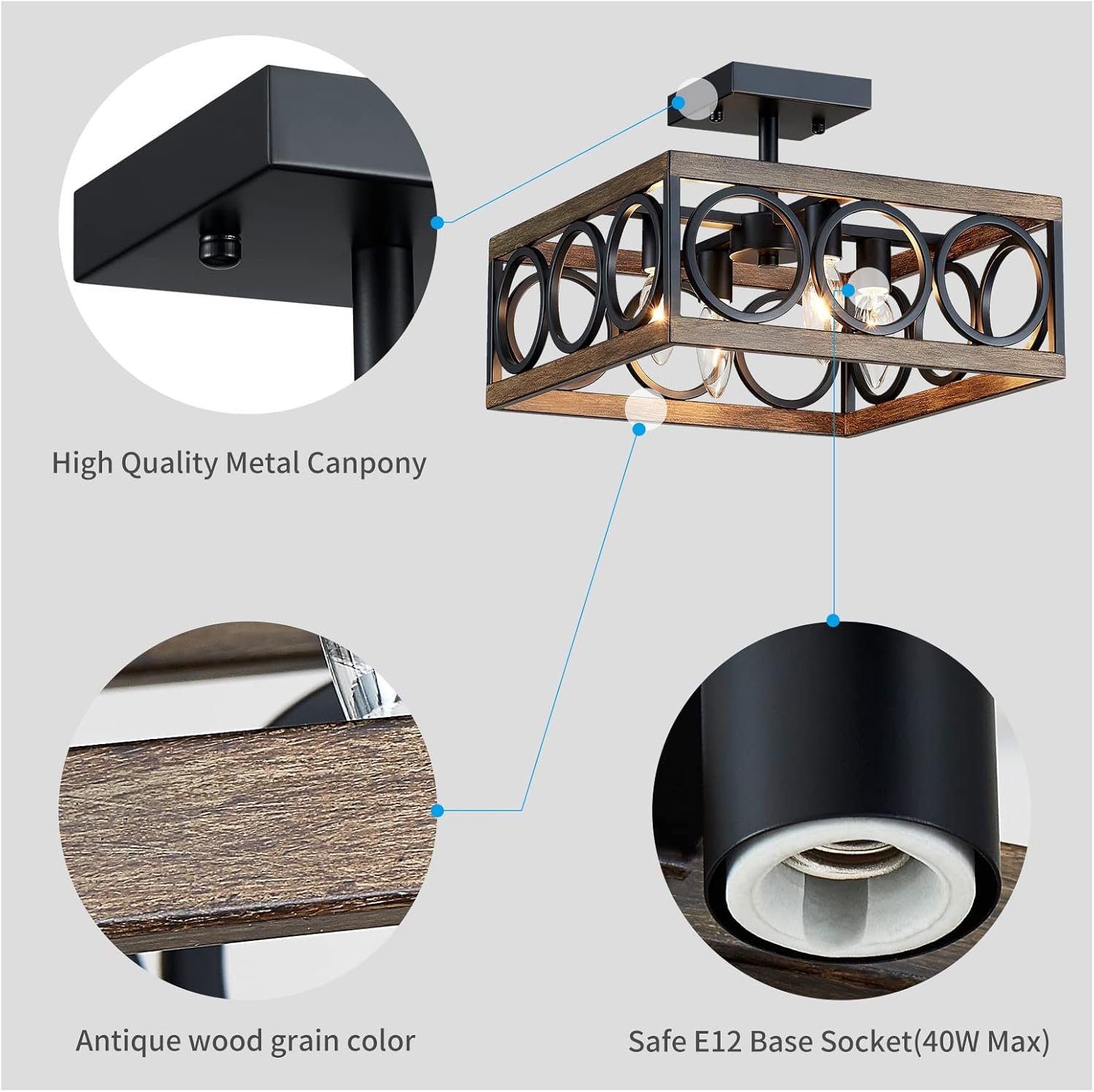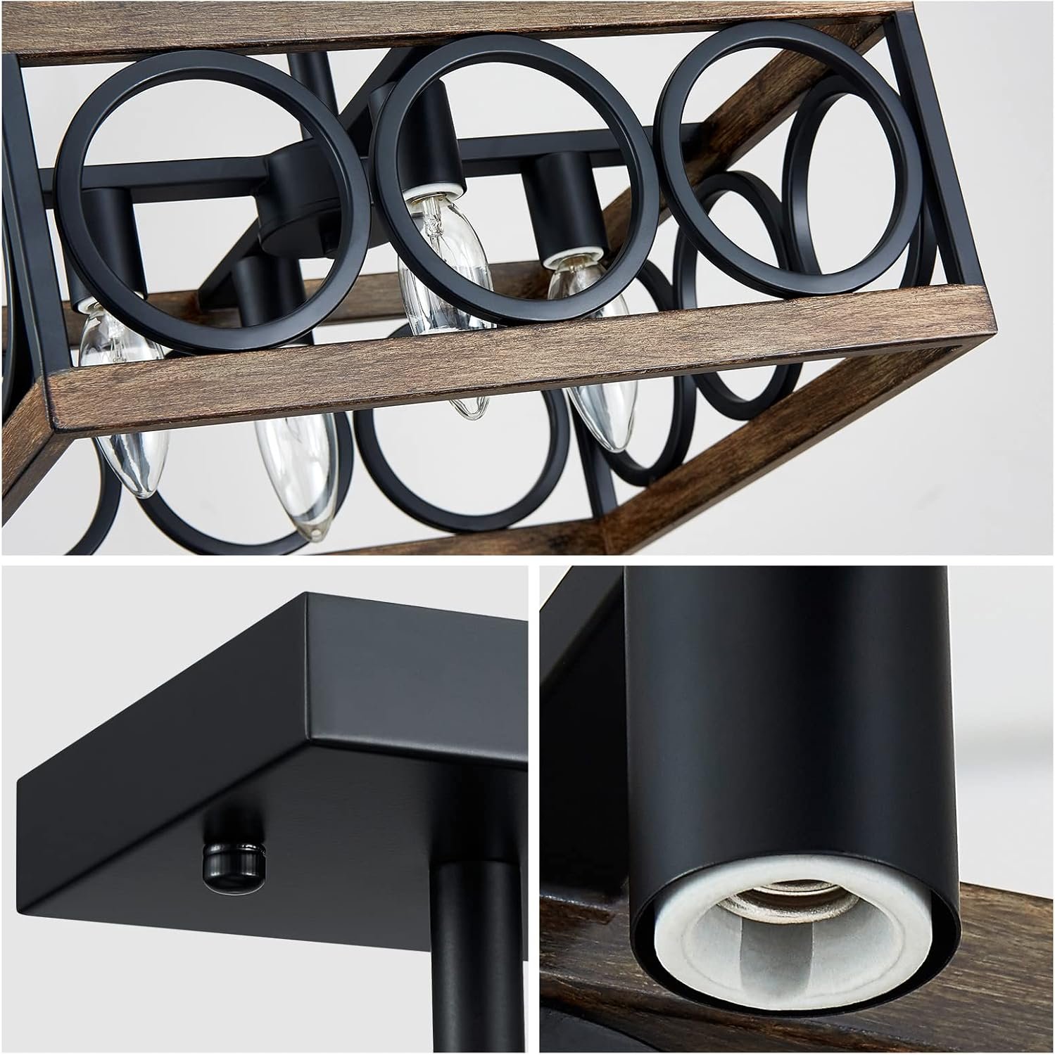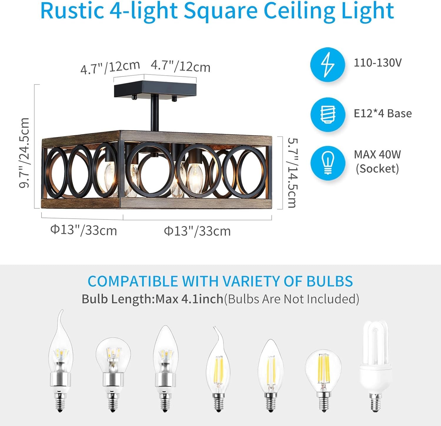 Diseño exquisito: esta lámpara de techo cercana cuenta con un marco cuadrado abierto único con un grano de madera antigua y acabado negro mate, hecho de metal duradero. Complementa perfectamente los estilos de decoración modernos y de granja, añadiendo un ambiente cálido a tu cocina, comedor u otros espacios de vida. Dimensiones: mide 33,0 cm de diámetro y 24,6 cm de altura, esta lámpara de araña negra viene con una barra colgante de 2,5 cm x 7,9 cm incluida, por lo que es adecuada para una variedad de espacios como pasillos, vestíbulos, entradas, dormitorios, islas de cocina, salas de estar, restaurantes, bares, talleres y más. [Bombillas y regulables]: Utilice hasta 4 bombillas de base E12 de 40 W (no incluidas), que son compatibles con bombillas LED, CFL, halógenas o incandescentes. La lámpara de techo empotrada de granja es totalmente regulable cuando se utiliza con un interruptor de atenuación (no incluido). La longitud recomendada de la bombilla no debe exceder las 10,4 cm. Se pueden lograr diferentes efectos de iluminación dependiendo de las bombillas utilizadas. Fácil instalación: todo el hardware necesario para la instalación está incluido en el paquete, junto con instrucciones detalladas para guiarlo a través del proceso. Si bien puede requerir algo de tiempo y esfuerzo, el resultado final valdrá la pena. [Garantía sin preocupaciones]: Ten en cuenta que el color de esta lámpara de techo vintage puede desviarse del producto real debido a varias razones, como cámaras, dispositivos de pantalla, brillo ambiental, etc., y su aspecto pintado a mano puede no ser estrictamente consistente. Sin embargo, si encuentras algún problema, piezas faltantes o necesitas ayuda con la instalación, ponte en contacto con nosotros por correo electrónico y te proporcionaremos una solución satisfactoria en 24 horas.