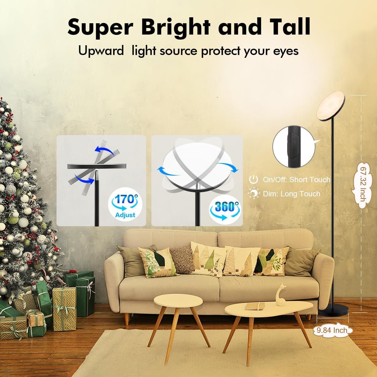 Cambio de color La lámpara de pie inteligente RGB Torchiere proporciona millones de colores claros. Puede sincronizar música y escenas preestablecidas, aunque el temporizador preestablecido para iluminar la lámpara con colores personalizados. Regulable continuo La lámpara de pie LED para sala de estar es de 2000 lúmenes, la temperatura de color de 2700K-6500K se puede ajustar sin problemas. Lámpara de pie brillante para toda la habitación con barra de ajuste del 1-100%. Interruptor continuo entre luz cálida y fría. Múltiples formas de control: la lámpara de pie inteligente YHW para dormitorio funciona con la aplicación Surplife, control remoto de 28 teclas e interruptor de pedal que son más cómodamente para controlar tu lámpara de pie. Fácil instalación: la lámpara de pie es fácil de montar en 5 minutos, conexión Bluetooth con sencillos pasos para controlar la lámpara a través del teléfono, señal estable sin conexión. Diseño clásico y moderno: esta moderna lámpara de pie para sala de estar con soporte de poste alto ahorra más espacio en tu habitación. Moderna lámpara de pie negra para proteger los ojos de la luz alta.