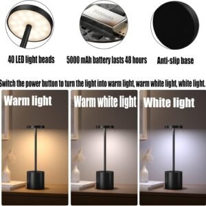 Lámparas de mesa inalámbricas El aspecto es simple y único, combinando el encanto de la modernidad y la moda. El conjunto está hecho de aleación de aluminio metálico, que no cambiará de color después de un uso prolongado. Carga USB universal, la longitud del cable de alimentación USB es de 149,9 cm, también puede cargar directamente la bombilla y usarla en la siguiente ubicación. Batería de gran capacidad Batería incorporada de 5000mA, protección ambiental, bajo consumo de energía, una carga completa puede ser utilizada durante 48 horas, las lámparas de mesa que funcionan con pilas son la primera opción para energía de respaldo de emergencia en caso de fallo repentino de energía. Diseño humanizado: 26,0 cm de alto x 8,0 cm de ancho, brazos de metal suaves y delgados, diseño circular, iluminación de área grande sin ángulo muerto de 360°, ligero y portátil. Adopta un diseño de interruptor de botón inteligente humanizado, solo necesitas tocar la luz para ajustar dos tipos de brillo para satisfacer diferentes necesidades ambientales. Se sugiere un ajuste de habitación Portátil y móvil, adecuado para restaurantes, bares, terrazas, mesitas de noche, salas de estudio. Además, permite sorprender a las personas, muy adecuado como regalo para familiares y amigos. Recibirás Recibirás 2 * lámparas de escritorio, 2 * cables de carga USB y 1 x guía de usuario.