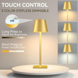 Servicio sin preocupaciones: Yogaret proporciona 2 años de mantenimiento para esta luz inalámbrica. Si tienes alguna pregunta, no dudes en decírnosla (inicia sesión en tu cuenta de Amazon y encuentra el pedido, luego ponte en contacto con el vendedor y escribe un mensaje), ¡por favor ten la seguridad de comprar! Lámpara de mesa recargable con batería: Batería recargable integrada de 6000 mAh, puede ser utilizada durante 12~42 horas, lámpara de mesa recargable completamente cargada por cable USB C en 6 horas (también se puede usar mientras se carga), esta característica la convierte en una lámpara de escritorio LED portátil perfecta que ahorra en facturas de baterías y electricidad. Resistente al agua/al clima IP65: Esta lámpara ha sido tratada con una capa impermeable, sin miedo a la erosión por la lluvia, para mantener una elegancia atemporal Atenuación de tres vías y atenuación sin escalones: Atenuación sin escalones (100%-3%); Rango de temperatura de color: 2700K (luz cálida) – 4000K (luz neutra) – 6500K (luz blanca); Cambia el modo de luz con un toque, mantén presionado para atenuar el brillo de la luz. El control táctil flexible puede satisfacer tus diversas necesidades en varios escenarios. Lámpara Inalámbrica Versátil: ¡Diga adiós a los cables! Esta lámpara está diseñada para ser inalámbrica y puede ser alimentada por USB, lo que te da la libertad de usarla en cualquier lugar. Ya sea que estés acampando, haciendo un picnic o disfrutando de una comida en un restaurante, esta lámpara portátil sirve como el compañero perfecto de mesa al aire libre. En casa, se transforma en una lámpara de mesa inalámbrica recargable, aportando luz a tu patio, mesa de comedor, bar, dormitorio, encimera de cocina, baño, escritorio de entrada, mesa auxiliar y mucho más.