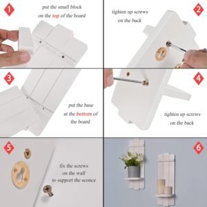 Material de primera calidad Nuestros portavelas de pared de madera están hechos de 100% madera de primera calidad y cubiertos con elegante pintura blanca, con fuerte resistencia a la corrosión. Cada decoración de estante de baño incluye un accesorio para colgar en la parte posterior, conveniente para colgar en la pared. Decoración especial de pared: el juego de dos apliques de pared con estilo moderno y rústico es maravilloso arte de pared para decoraciones. Las diferentes combinaciones con otras decoraciones hacen que se mezclen con tu hogar en diferentes estilos como moderno, rústico y de granja. Múltiples diseños Abra sus talentos artísticos para combinar múltiples adornos rústicos con estos portavelas de granja. Con velas, tarros, jarrones, plantas pequeñas u otras piezas decorativas en los candelabros, serían decoraciones de pared únicas y elegantes para tu hogar. Fácil de montar: utiliza el destornillador y los tornillos para fijar las tres tablas y luego el montaje del portavelas de pared está terminado. Presta atención a la diferencia entre la parte superior e inferior de los apliques de pared durante el montaje. El paquete incluye un destornillador y tornillos. Amplia aplicación: los apliques de vela de pared pueden añadir un toque artístico a la sala de estar, comedor, dormitorio, pasillo, baño o cocina, decorando una casa moderna. Además, el juego de 2 candelabros para decoración de pared es un regalo perfecto para alguien que ama el arte de pared de estilo granja.