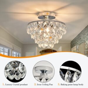 LUZ DE TECHO EMPOTRADA Tamaño: 23,0 cm de alto y 25,0 cm de ancho Luz Cómoda: 110 V, 60 vatios; base de la bombilla: E26. (*Bombillas no incluidas* Necesitas obtener 1 bombilla LED E26 dependiendo de los efectos de iluminación que desees). Diseño compacto: los cristales brillantes que tienen un tacto y sensación de cristal hacen que sea difícil de romper y podrían crear un ambiente superior y elegante en tu habitación Instalación Fácil: Requiere montaje (incluye colgar las cuerdas de cristal en la placa plateada), pero fácil de instalar y todo el hardware de montaje y un detallado manual de instrucciones de montaje incluido. Garantía sin preocupaciones: no dude en ponerse en contacto con nosotros si hay algún problema de calidad o no está satisfecho con su compra (90 días de devolución de dinero y 2 años de garantía de reemplazo).
