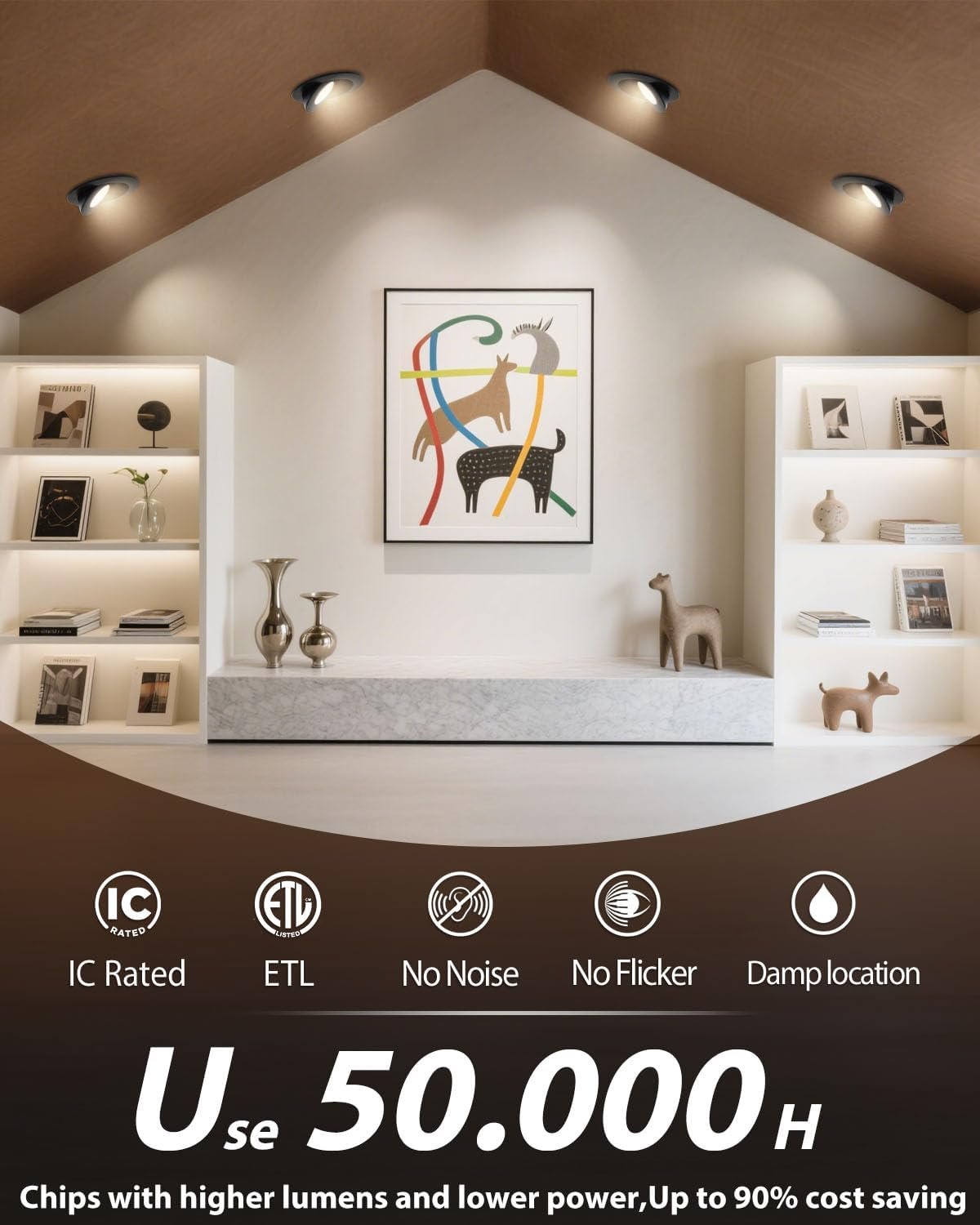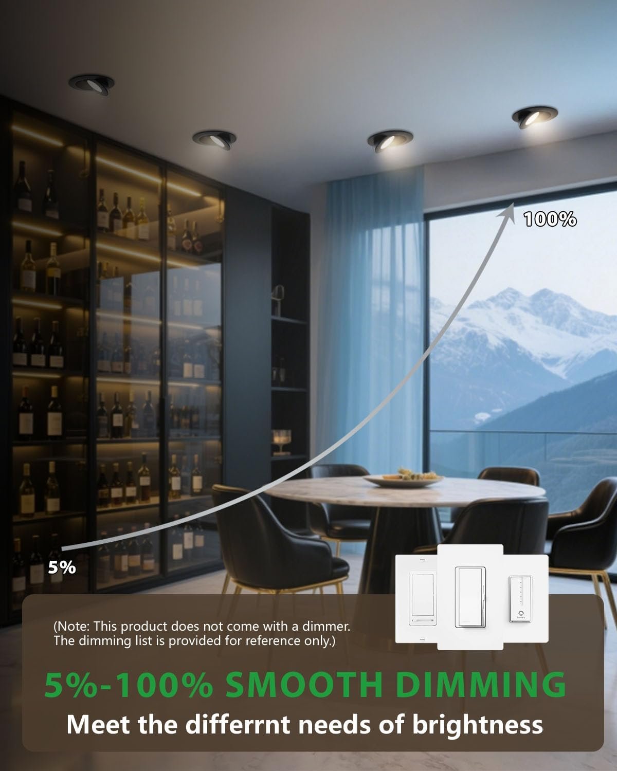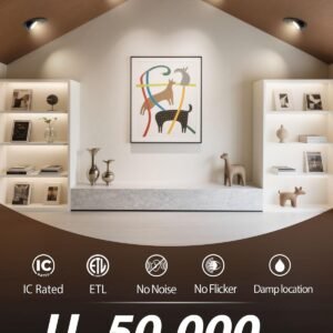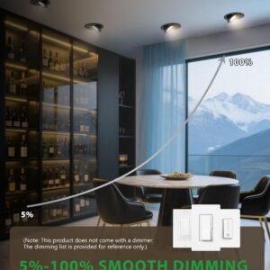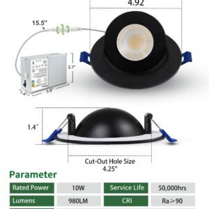 Rotación de 360° y inclinación de 90° Las luces LED de cardán de 10,2 cm se giran 360° y se inclinan hasta 90°, proporcionando una iluminación direccional precisa para resaltar obras de arte, encimeras o características arquitectónicas. 5 temperaturas de color Ajusta fácilmente la temperatura del color a través del interruptor deslizante de la caja de conexiones. Elige entre 2700 K (blanco suave), 3000 K (blanco cálido), 3500 K (blanco neutro), 4000 K (blanco frío) y 5000 K (luz diurna) para que coincida perfectamente con tu habitación y ambiente. Atenuación suave (5%-100%) Compatible con la mayoría de los reguladores para una atenuación suave, sin parpadeos y sin zumbidos. Ideal para cocinas, salones, lugares de trabajo, áreas comunes y sofitos. Alto brillo y eficiencia energética: utiliza chips LED de próxima generación, ofreciendo 980 lúmenes con solo 10 W, ahorrando hasta un 88% en costos de energía mientras proporciona una iluminación brillante y uniforme. Clasificación IC y fácil instalación con certificación ETL y Energy Star, con terminales de cable certificados UL y una caja de conexiones térmicamente protegida. Diseño de perfil bajo que se adapta a retrofits y nuevas construcciones. Simplemente corta un agujero en el techo de 4.02 11,5 cm (102 115 mm), conecta la caja de conexiones y asegúralo con clips de resorte.