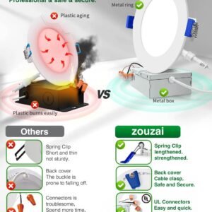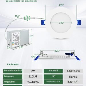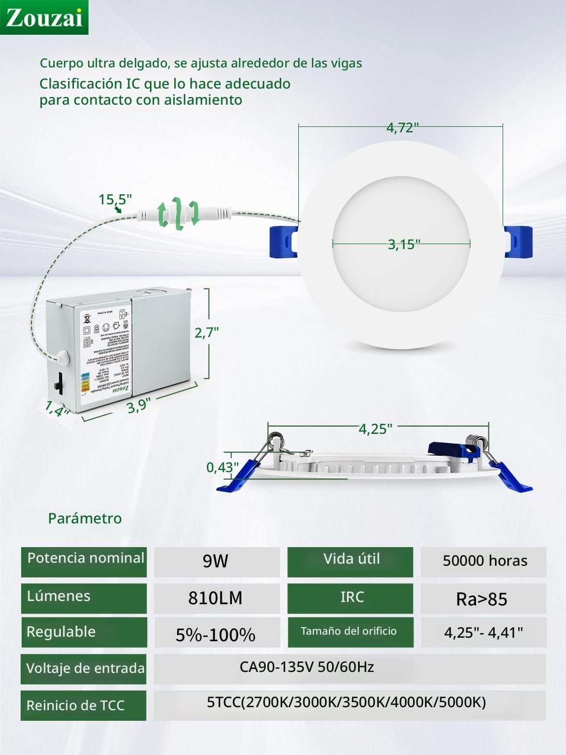 5CCT seleccionable Adopta un nuevo diseño, la luz se puede ajustar como 2700 K (blanco suave) o 3000 K (blanco cálido) o 3500 K (blanco frío) o 4000 K (blanco diario) o 5000 K (blanco transparente) a la vez para satisfacer tus necesidades. Solo un clic en el lateral de la caja y elegirá el color más deseado que mejor se adapte a su casa. Elige el color más deseado que mejor se adapte a tu casa. Regulable : cuerpo ultrafino, atenuación suave del 5% al 100%, compatible con la mayoría de los reguladores, ubicación húmeda adecuada, satisface tipos de necesidades en aplicaciones como cocina, sala de estar, dormitorio, baño, lugar de trabajo, garaje, pasillos, sótano, aleros exteriores y otros espacios de difícil acceso. Alto brillo Estas luces empotradas delgadas de 10,2 cm utilizan chips LED avanzados, ofreciendo 810 lúmenes con solo 9 vatios de potencia, equivalente a una lámpara halógena de 80 W, ahorrando hasta un 95% en costos de energía anuales. Clasificación tipo IC Esta luz LED empotrable sin lata tiene clasificación IC, certificación ETL y el terminal de cable está certificado por UL. Se permite estar en contacto con aislamientos en techos, lo que significa que la caja de conexiones está protegida térmicamente. Fácil de instalar La iluminación empotrada de bajo perfil es adecuada para modernización y decoración nueva: corta un agujero en el techo con plantilla de orificio 1:1; conecta la caja de conexiones al cable; utiliza un clip de resorte para fijarlo en el techo. Sin complicaciones, la instalación se puede completar en minutos. Solo requiere espacios de techo tan pequeños como 5,1 cm, se adapta a varios techos y vigas. La lata empotrada ya no es una limitación para su elección. Servicio de satisfacción 100% Respaldamos completamente nuestros productos, ofreciendo un servicio integral de 5 años que cubre cualquier mal funcionamiento o defecto de las luces LED. Esto garantiza que esté protegido durante 5 años. La lámpara zouzai tiene una vida útil de hasta 50.000 horas, ofreciendo durabilidad y eficiencia energética. Está certificado por ETL, Energy Star, FCC, y equipado con terminales de conexión rápida aprobados por UL para un cableado seguro. La luminaria tiene clasificación IC, lo que la hace segura para el contacto directo con el aislamiento. Con un diseño clasificado para ambientes húmedos, es adecuado para uso en interiores y áreas exteriores cubiertas (como bajo aleros), pero no para exposición directa al agua. La carcasa está hecha de aluminio resistente a la corrosión, lo que garantiza una resistencia y fiabilidad duraderas.