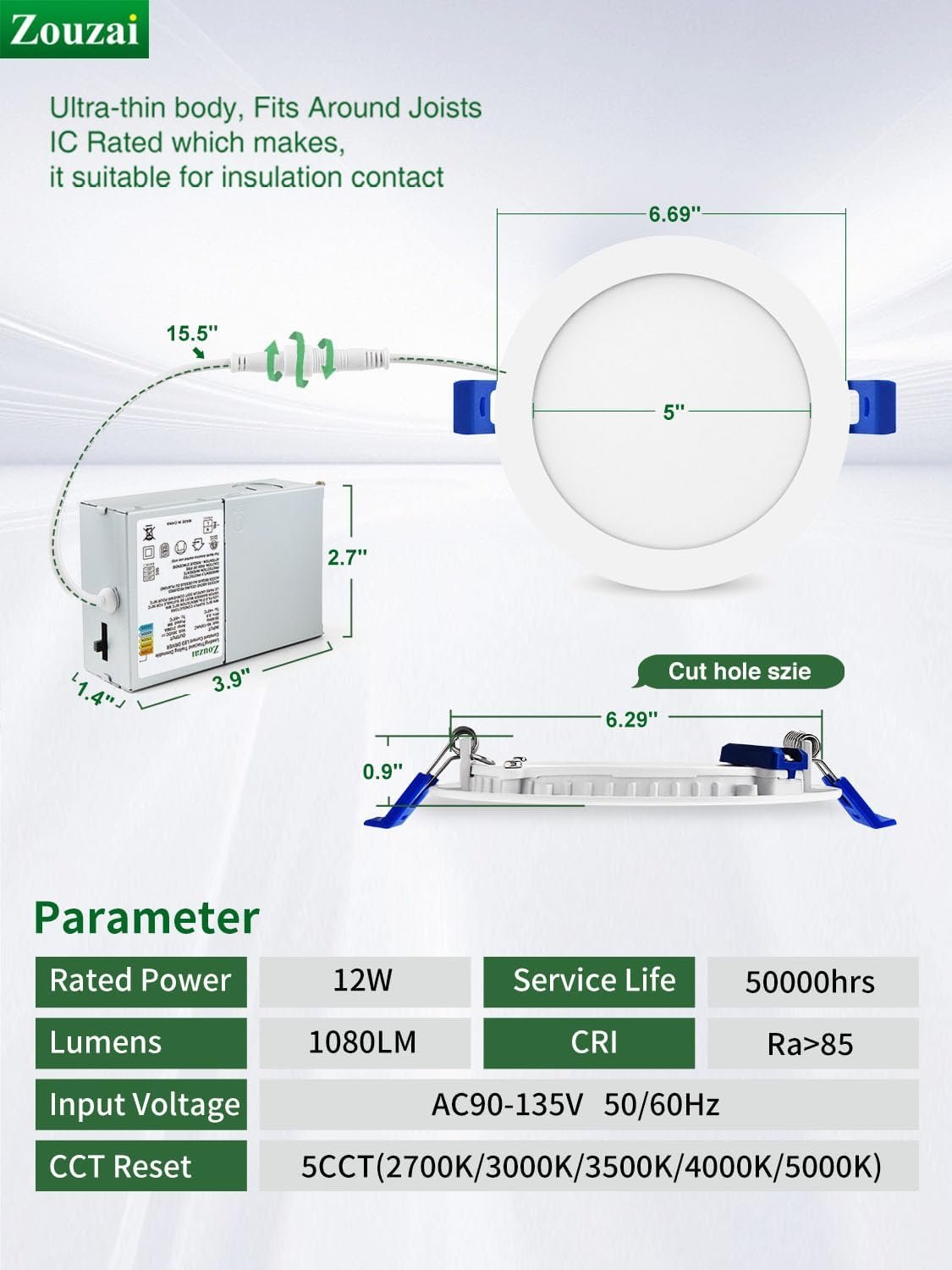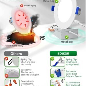 5CCT seleccionable Adopta un nuevo diseño, la luz se puede ajustar como 2700 K (blanco suave) o 3000 K (blanco cálido) o 3500 K (blanco frío) o 4000 K (blanco diario) o 5000 K (blanco transparente) a la vez para satisfacer tus necesidades. Simplemente haga clic en el lateral de la caja y elegirá el color más deseado que mejor se adapte a su casa. Elige el color más deseado que mejor se adapte a tu casa. Fácil de instalar La iluminación empotrada de bajo perfil es adecuada para modernización y decoración nueva: corta un agujero en el techo con plantilla de orificio 1:1; conecta la caja de conexiones al cable; utiliza un clip de resorte para fijarlo en el techo. Sin complicaciones, la instalación se puede completar en minutos. Solo requiere espacios de techo tan pequeños como 5,1 cm, se adapta a varios techos y vigas. La carcasa empotrada ya no es una limitación para tu elección. Clasificación Tipo IC Esta luz LED empotrada sin caja tiene clasificación IC, certificación ETL y el terminal de cable está certificado por UL. Se permite que esté en contacto con aislamientos en techos, lo que significa que la caja de conexiones está protegida térmicamente. Super Delgado Sin parpadeo y sin ruido Alto brillo, alto índice de reproducción cromática La luz tiene una vida útil de hasta 50.000 horas, ofreciendo durabilidad y eficiencia energética. Está certificado por ETL, Energy Star, FCC, y equipado con terminales de conexión rápida aprobados por UL para un cableado seguro. La luminaria tiene clasificación IC, lo que la hace segura para el contacto directo con el aislamiento. Con un diseño clasificado para ambientes húmedos, es adecuado para uso en interiores y áreas exteriores cubiertas (como debajo de los aleros), pero no para exposición directa al agua. La carcasa está hecha de aluminio resistente a la corrosión, lo que garantiza una resistencia y fiabilidad duraderas. Estas cosas son impresionantes y no puedo recomendarlas lo suficiente. Es increíble lo bien construidos que están por el precio. A++ Regulable Cuerpo ultrafino, atenuación suave del 5%-100%, compatible con la mayoría de los reguladores, adecuado para ubicaciones húmedas, satisface todo tipo de necesidades en aplicaciones como cocina, sala de estar, dormitorio, baño, lugar de trabajo, garaje, pasillos, sótano, aleros exteriores y otros espacios de difícil acceso. Servicio de satisfacción 100% Respaldamos completamente nuestros productos, ofreciendo un servicio integral de 5 años que cubre cualquier mal funcionamiento o defecto de las luces LED. Esto garantiza que esté protegido durante 5 años.