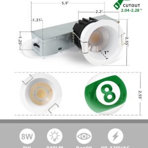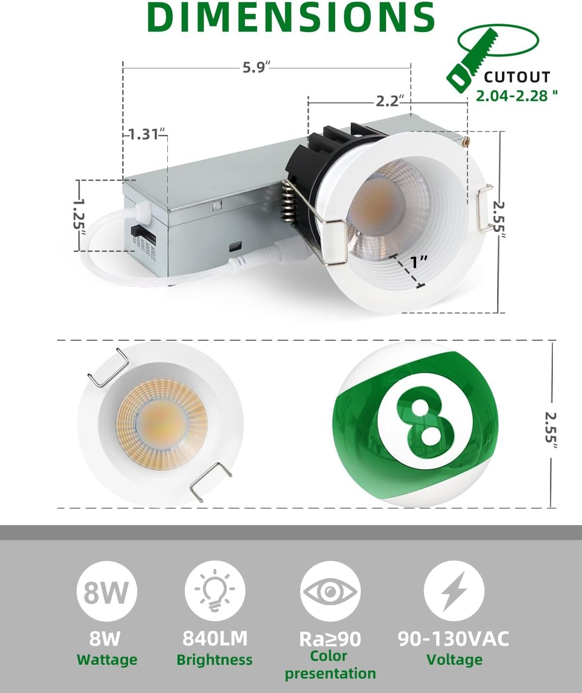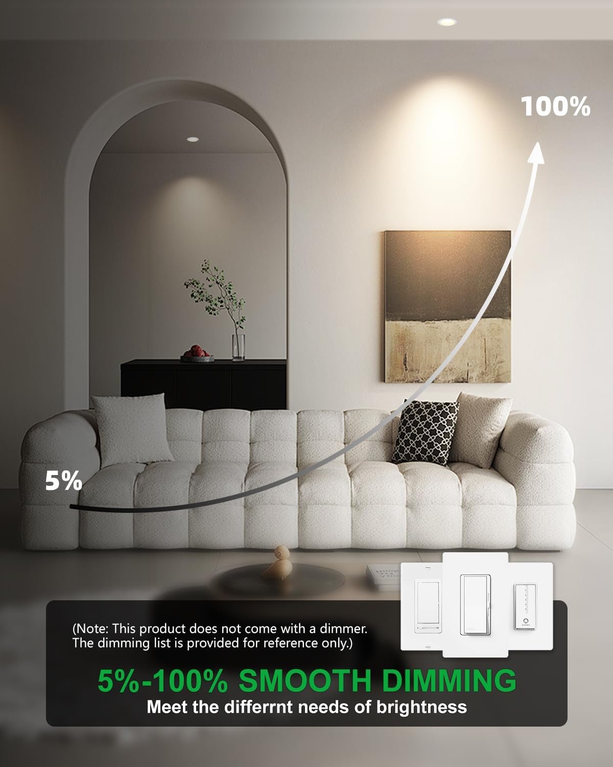 Cuenta con un deflector negro empotrado de 2,5 cm de profundidad para reducir eficazmente el deslumbramiento y minimizar la fatiga ocular, proporcionando una iluminación cómoda y enfocada para cualquier espacio. Fácil de usar y fabricado con aleación de aluminio de alta calidad para una excelente disipación del calor, asegurando una vida útil más larga y un aspecto elegante y moderno. Fácil de cambiar entre temperaturas de color de 2700K, 3000K, 3500K, 4000K y 5000K para adaptarse a varios estados de ánimo y configuraciones. El alto índice de reproducción cromática (Ra > 90+) ofrece colores vivos y realistas. Soporta atenuación del 5% al 100% con la mayoría de los interruptores de atenuación compatibles con LED, lo que te permite personalizar los niveles de brillo sin esfuerzo. (Nota: el interruptor de atenuación no está incluido y debe comprarse por separado) Potente LED de 8 W con 840 lúmenes, ángulo de haz de 40° y fácil instalación. Foco empotrado compacto de 5,1 cm (6,5 cm de diámetro x 5,6 cm de altura, corte de 5,1 cm) proporciona una luz brillante y direccional, ideal para iluminación de acento y tareas. Clasificación IC para un contacto seguro con aislamiento, equipado con una caja de conexiones, clips de resorte y compatible con recortes de techo estándar de 5,1 cm. Funciona en AC120V 50/60Hz con controlador incluido.